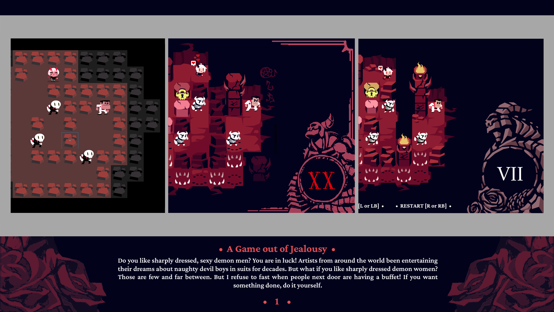that being said: i think this is a self-indulgent creation that was executed well. i thought the visuals were amazing (those backgrounds! the animations!), and the puzzles were genuinely challenging! it wasn’t a serious game writing-wise by any means, but it owned its concept and went hard on the stuff it did want to be: silly and fun and aesthetically well-done. and complete, too – no overambitious goals that went beyond what i imagine the dev wanted to accomplish. he just wanted to see the thing (the thing being demon girls in suits) and built it. i seriously have to stan.