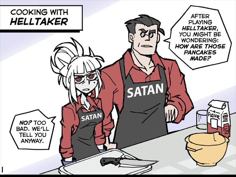 by the way, the artbook also has this folder that teaches you how to make pancakes (it’s a thing in the game). it’s a little multimedia comic with the helltaker characters + some of their dialogue overlaying gifs of, i assume, the creator’s hands actually preparing the pancakes step by step. the instructions for the pancakes (and the apple pie, in the anniversary artbook) have some notes that indicate some Polish-Style Flavorings of the recipe. the artist is polish, which is why i think this is his actual handiwork and not just him screengrabbing from a youtube video.